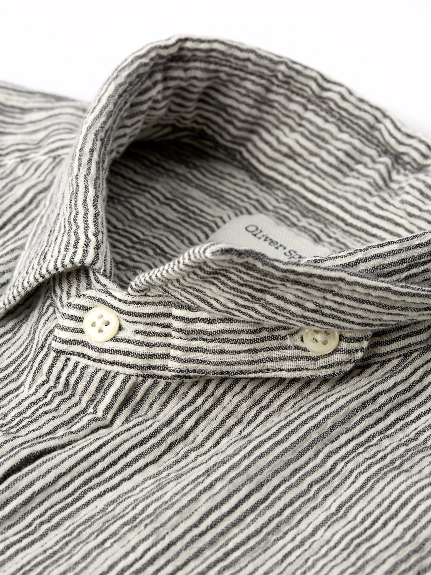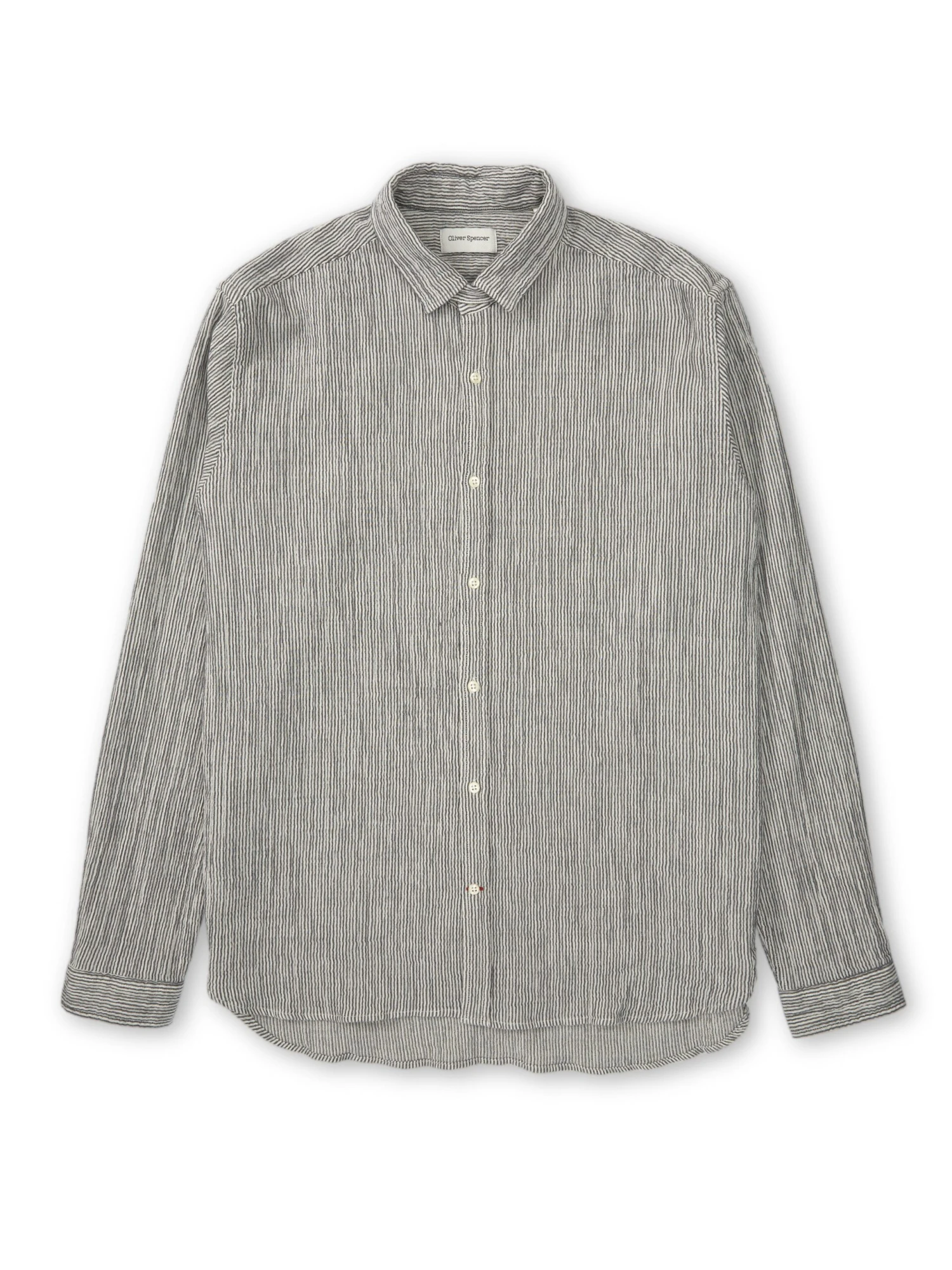 The Clerkenwell Tab Shirt is an Oliver Spencer favourite and a wardrobe staple. Featuring a slim, square collar that conceals an optional fastening tab, a soft one buttoned cuff and signature red bar-tacked button hole complete the subtle attention to detail that has become synonymous with Oliver Spencer. This version has been cut from a textural cotton with a subtle stretch, and features narrow navy stripe.