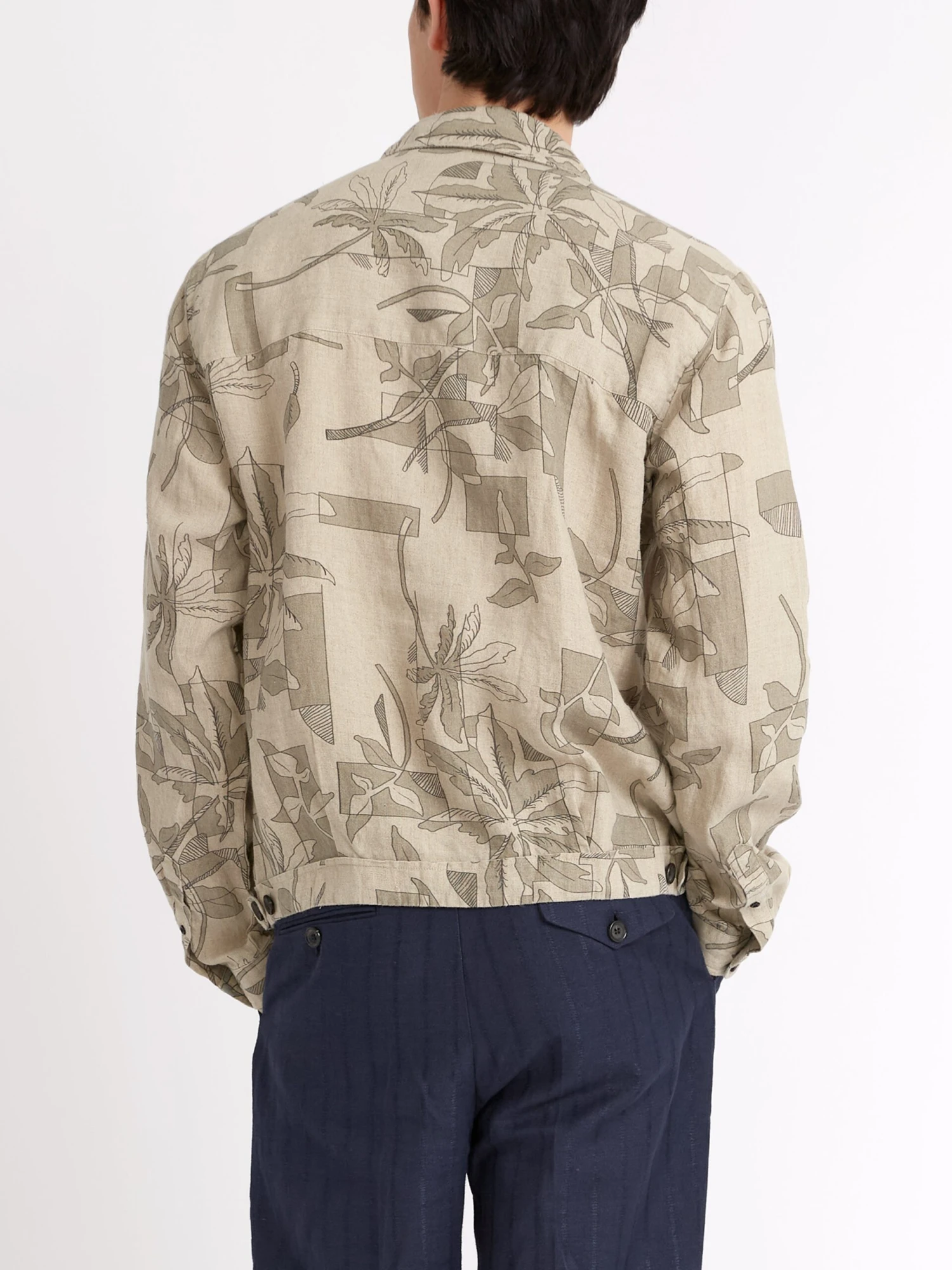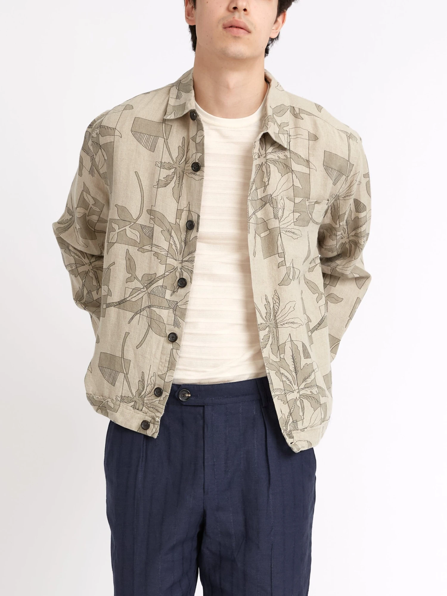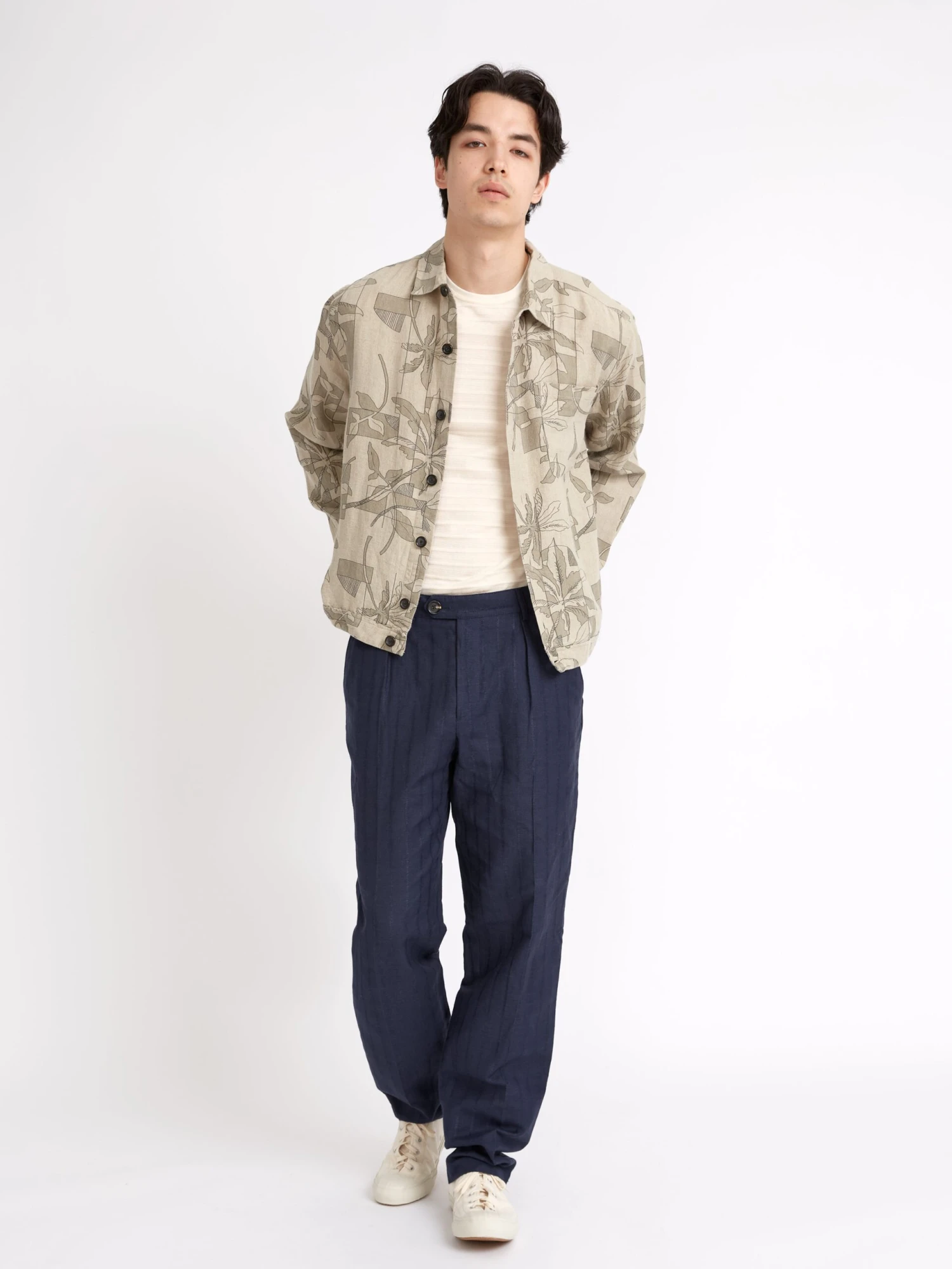 In the spring and summer months, short jackets are wardrobe workhorses, being great vehicles to add a layer of texture and colour to your looks. The Milford is one such jacket. It’s a ‘shacket’ in modern parlance, crafted from a wonderfully soft and slubby linen fabric, so that it feels like a shirt but acts like a jacket. This beige version with a floral pattern looks great layered over a white tee and paired with any or our navy trousers.