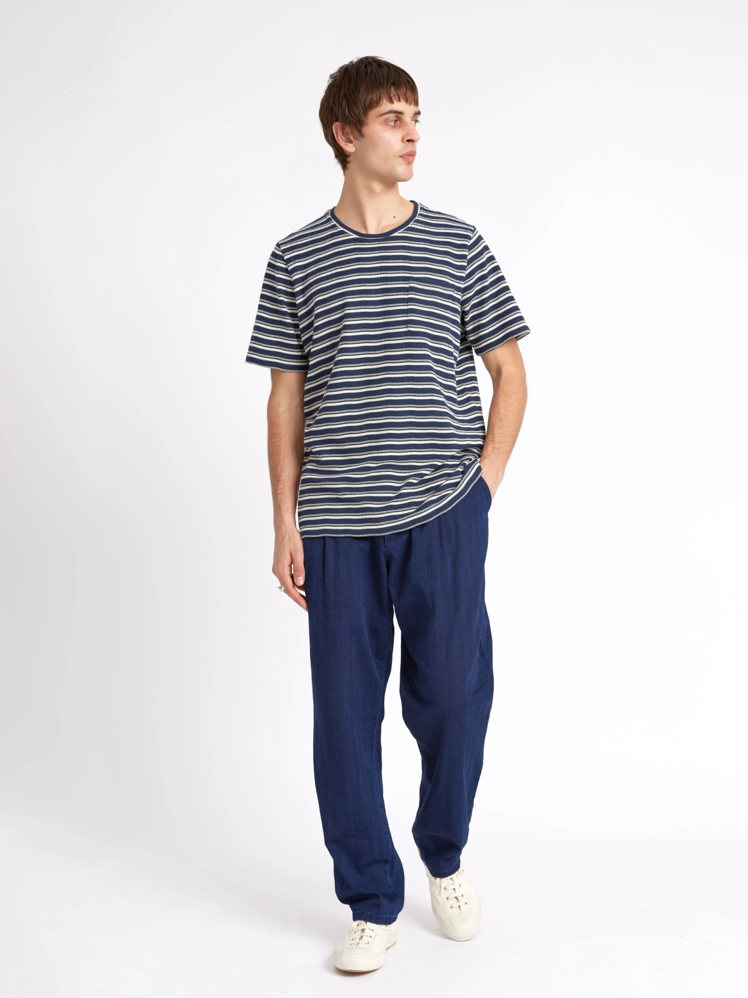 Crafted from a cotton and modal blend, Oli’s t-shirt is silky soft to the touch, and makes for a beautiful spring tee. This striped version pairs well with navy chinos and dark denim.