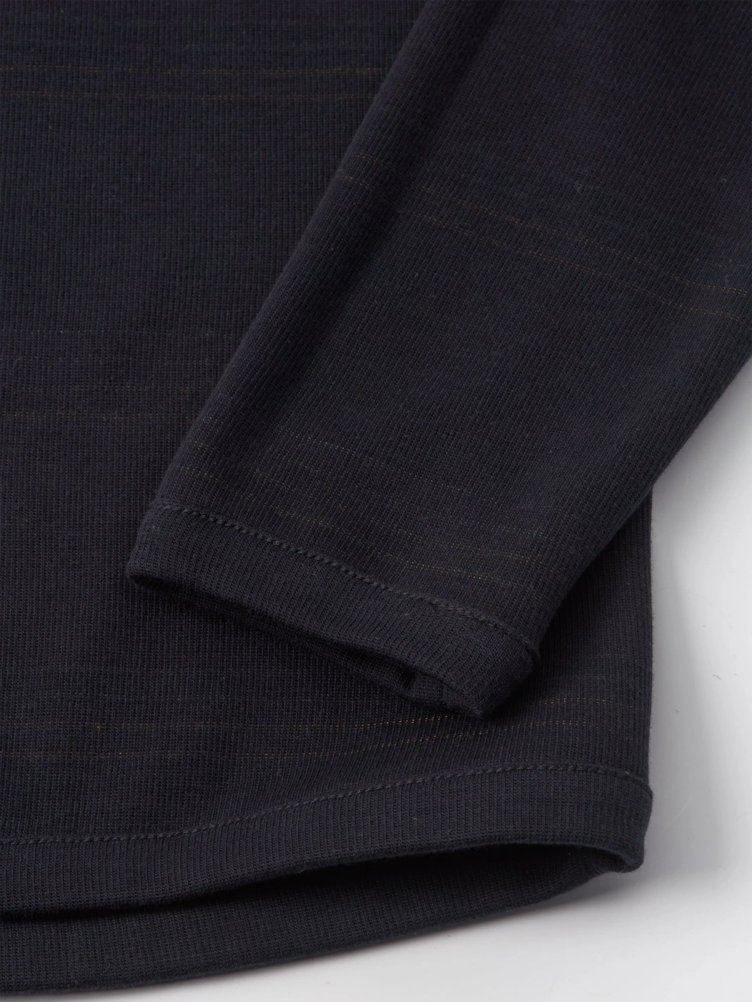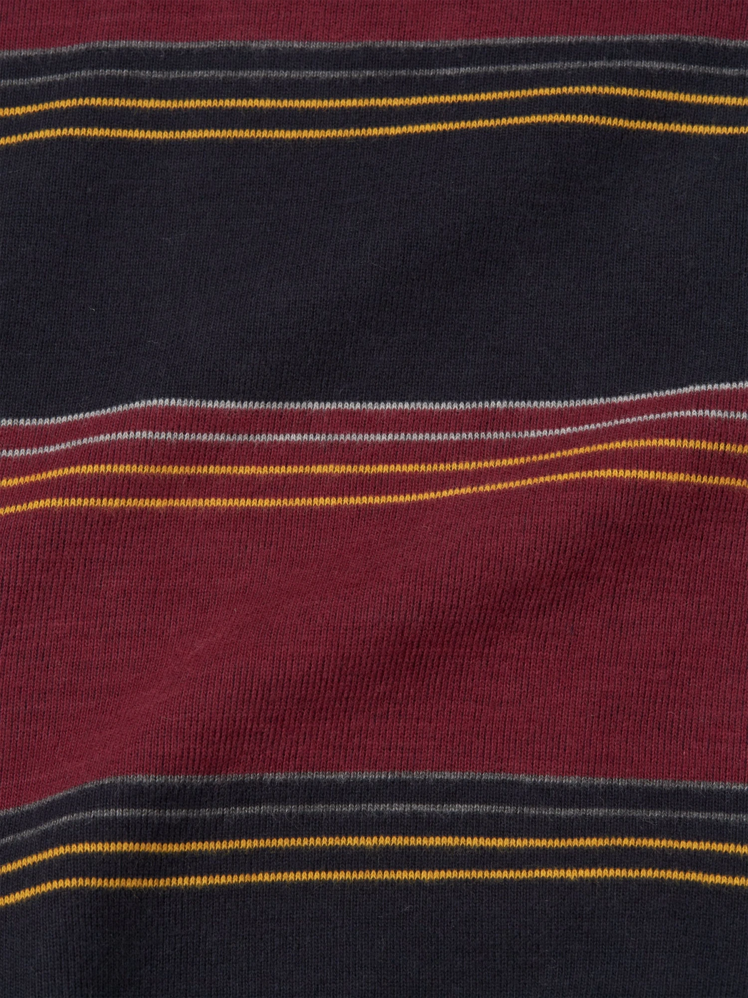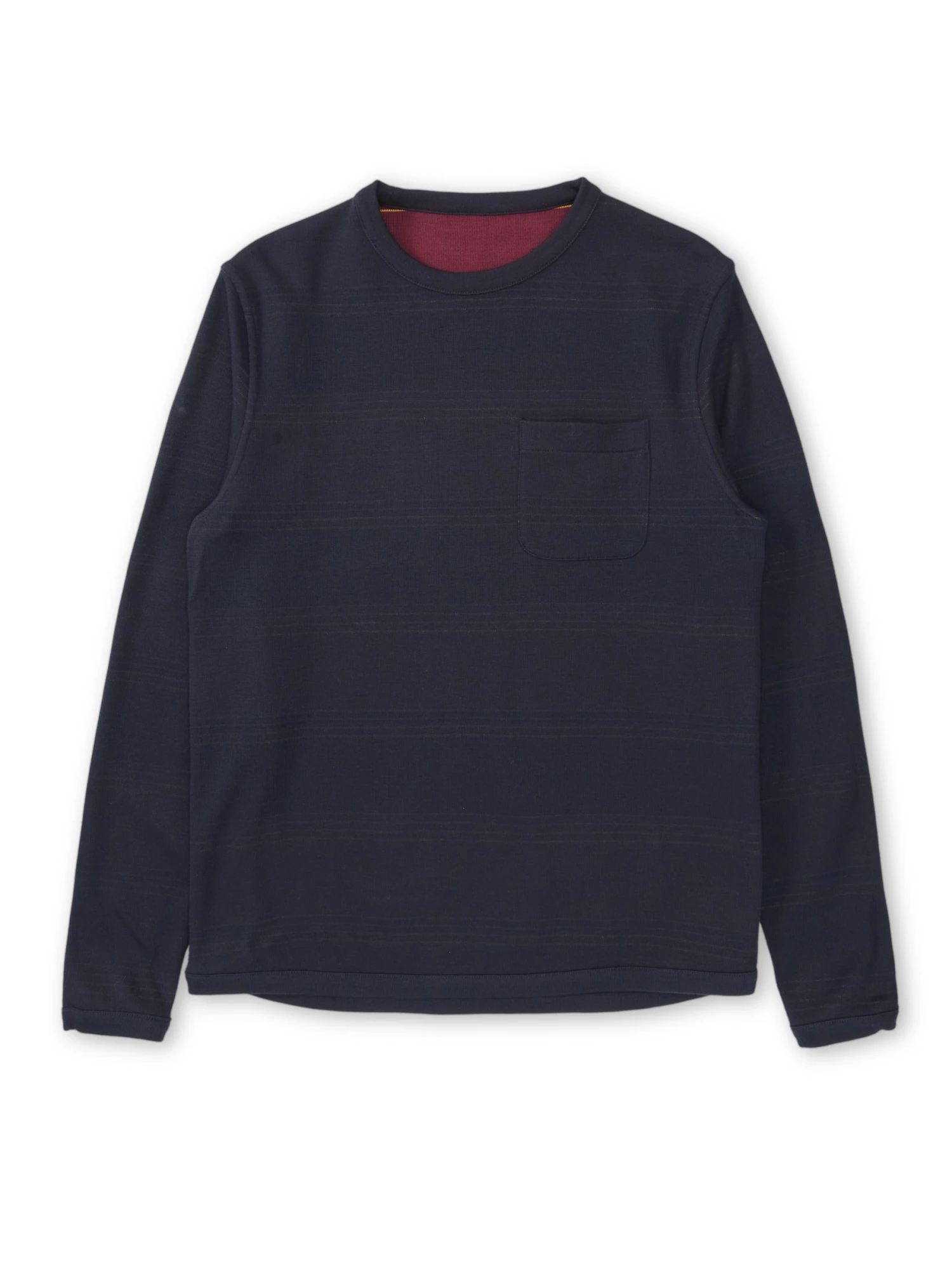 Woven using a midweight organic cotton blend, this versatile long-sleeve t-shirt features navy and burgundy stripes, making it an excellent layering piece with blousons, shackets and overshirts. What’s more, it’s reversible, allowing for a plain navy version, too.