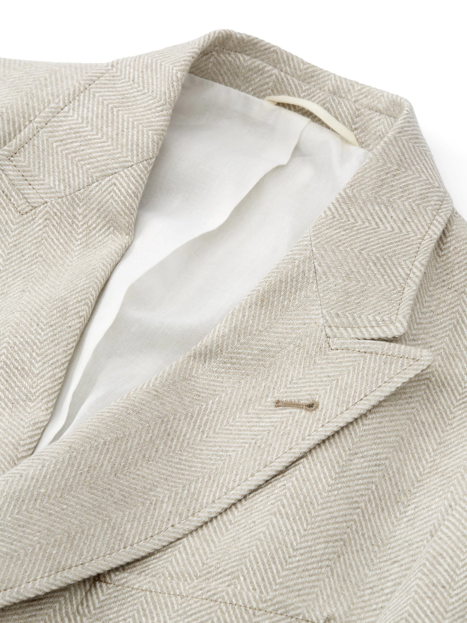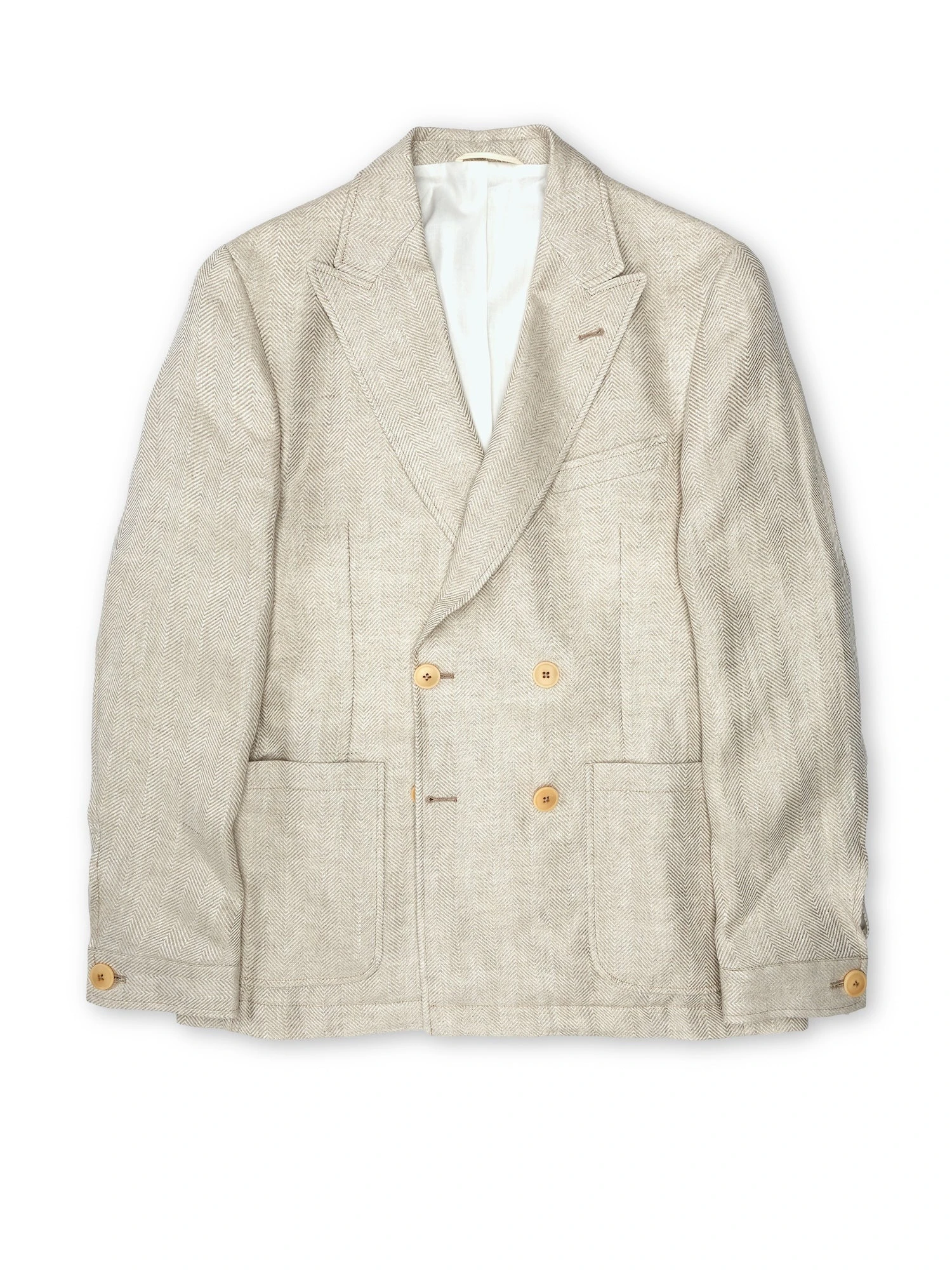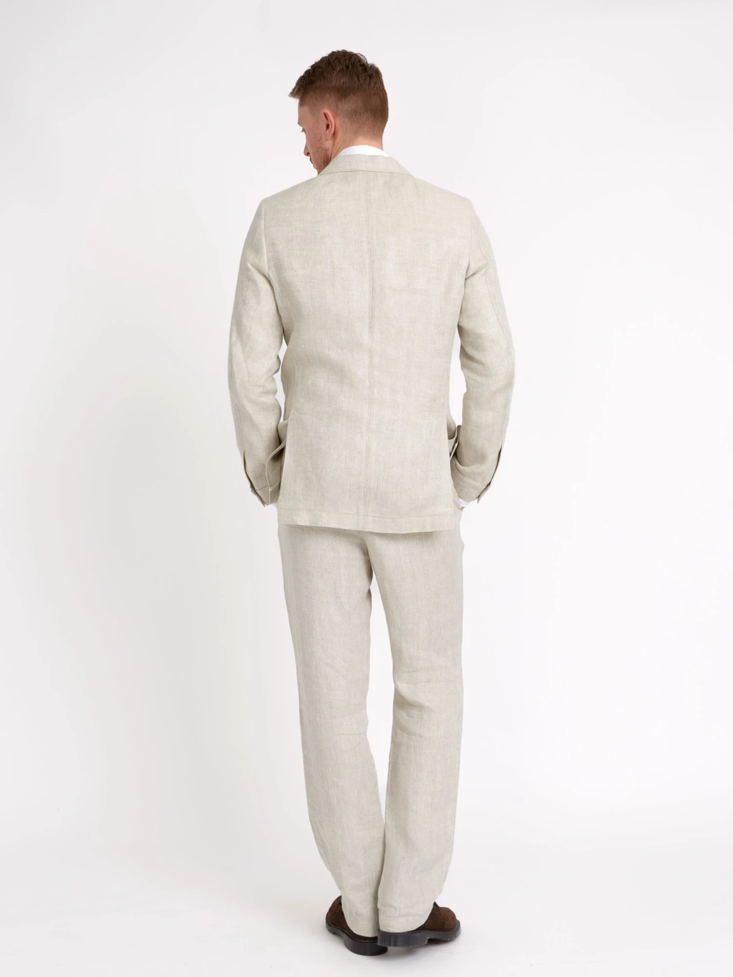 Every smart summer wardrobe needs a light tone suit, so we created this beautifully textural sand-coloured double-breasted suit to tick all the boxes. Cut with a slim silhouette, the jacket features a peak lapel and a minimalist 2 x 1 (“button one, show one”) button configuration. Crafted from a soft slubby linen, the suit features relaxed drawstring trousers for a modern finish.