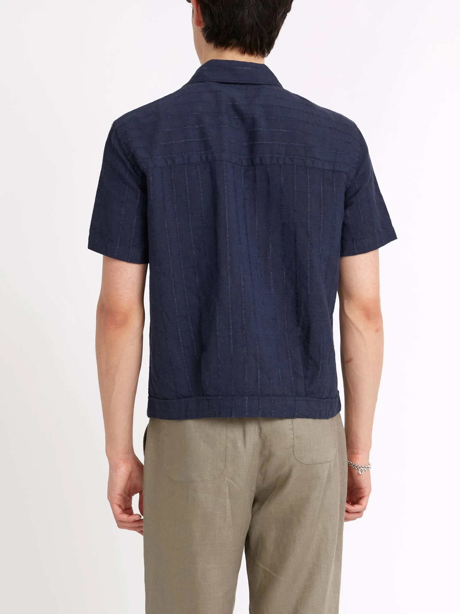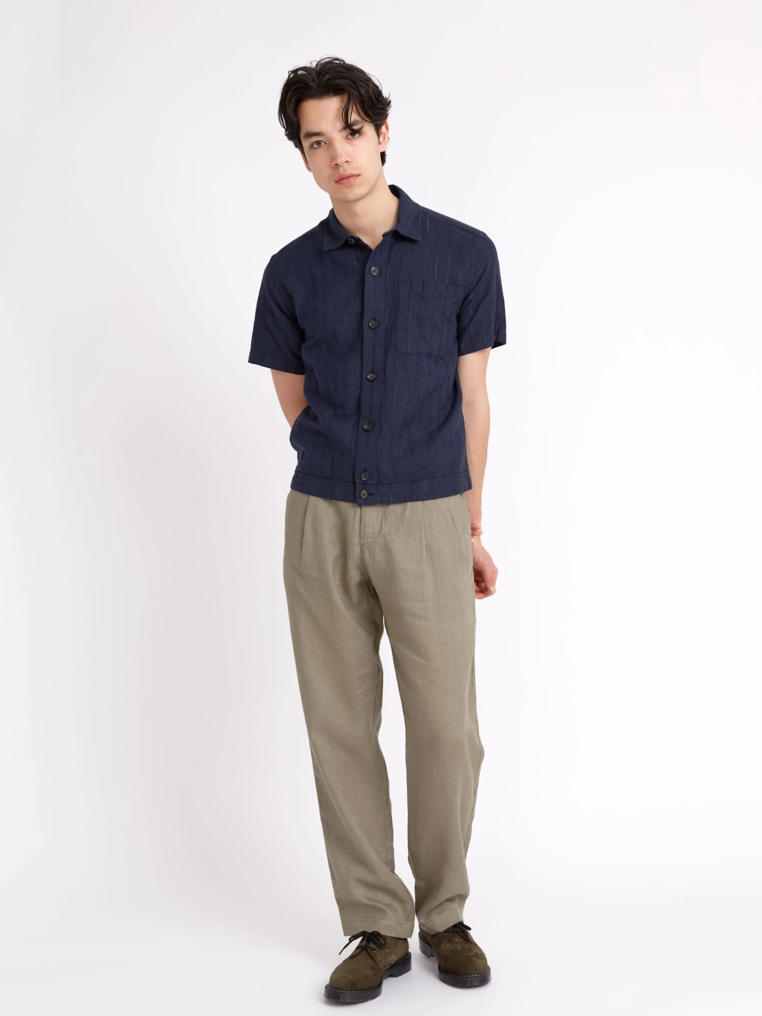 Crafted in a beautifully soft premium ecological linen fabric, our Milford shirt in Dillard navy is a great summer option for casual fits and relaxed tailoring. Featuring a subtle stitch detail which gives the impression of tonal stripes, it’s perfect to wear with our unstructured suits for an understated look of relaxed elegance.
